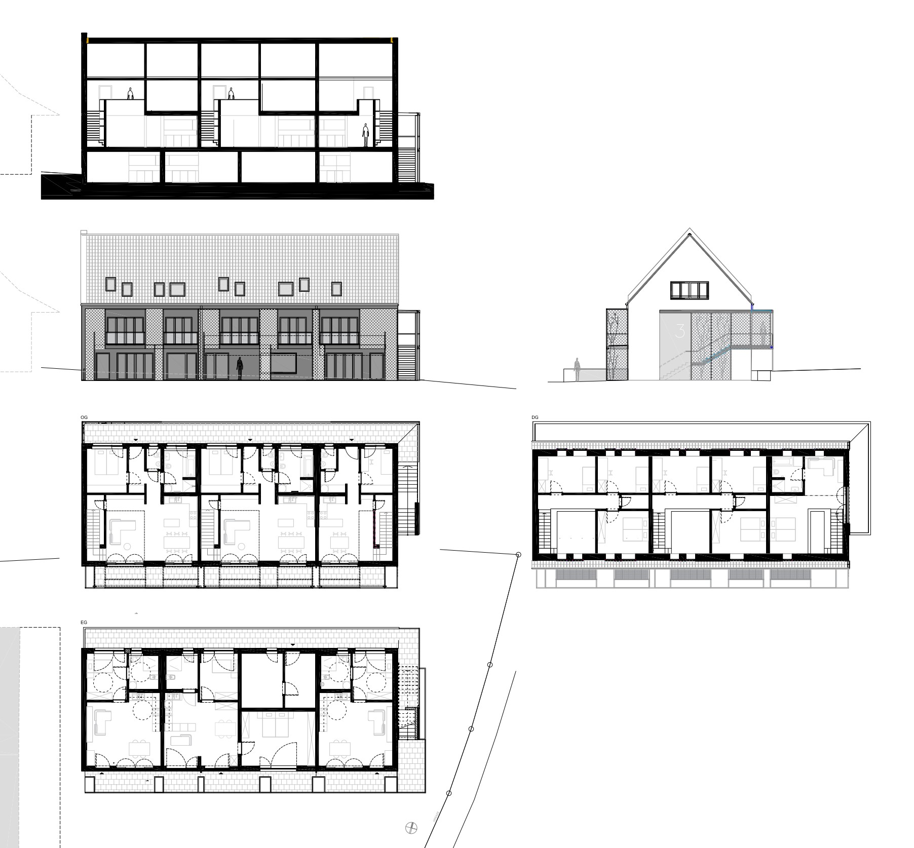 Die Familienwohnungen werden über eine außenliegende Treppe mit anschließendem Laubengang erschlossen. Sie erstrecken sich jeweils über zwei Geschosse und verfügen durch ihren direkten Zugang über eine eigenständige Adresse. In ihrer räumlichen Organisation bieten sie die Qualitäten eines kleinen Reihenhauses. Unterschiedliche Wohnungsgrößen ermöglichen eine flexible Belegung. Die Grundrisse sind modern und effizient geschnitten und bieten durch eine durchdachte Raumorganisation großzügige Stauraummöglichkeiten sowie Spielraum zur individuellen Aneignung. In den Kinderzimmern schafft eine teilweise eingezogene Holzzwischendecke mit integrierter Stauraumgalerie zusätzliche Nutzfläche und verleiht den Räumen eine besondere Großzügigkeit.